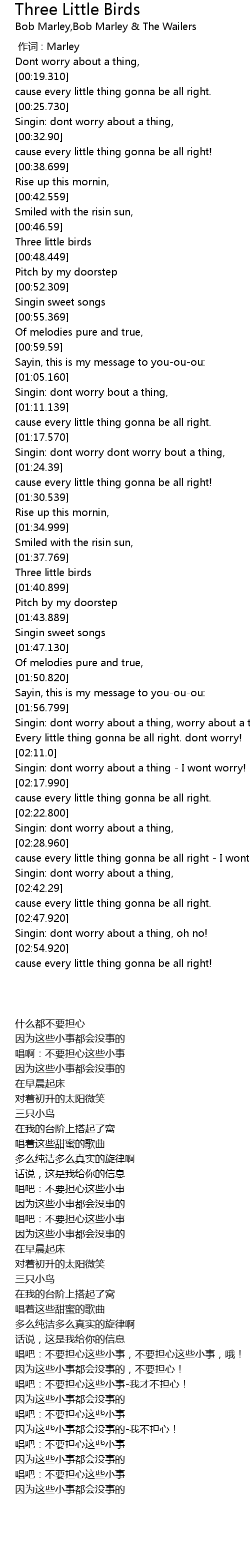 | [01:58.799] | Singin: dont worry about a thing, worry about a thing, oh! |