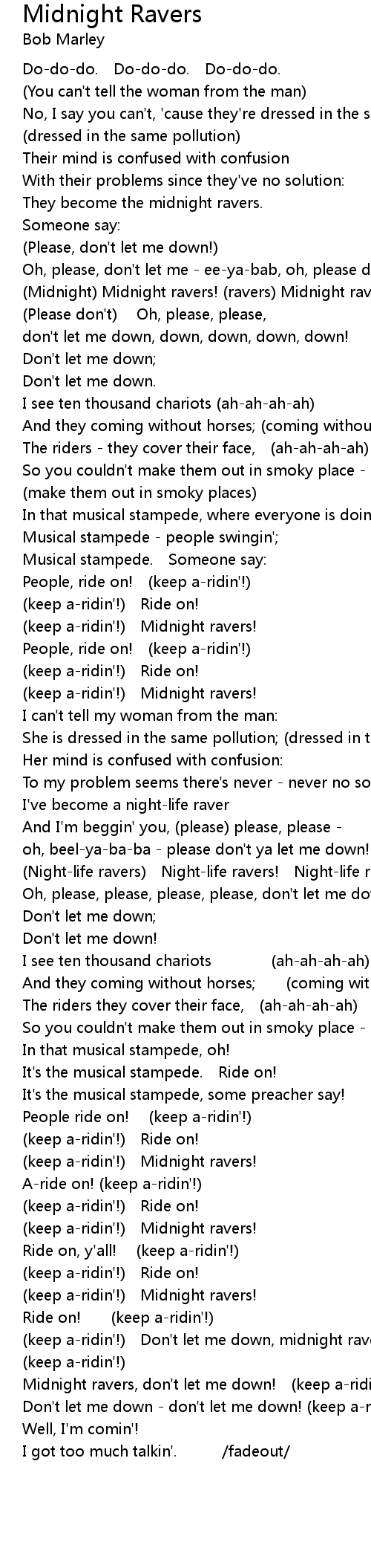 | Midnight ravers, don't let me down! (keep a-ridin'!) | |