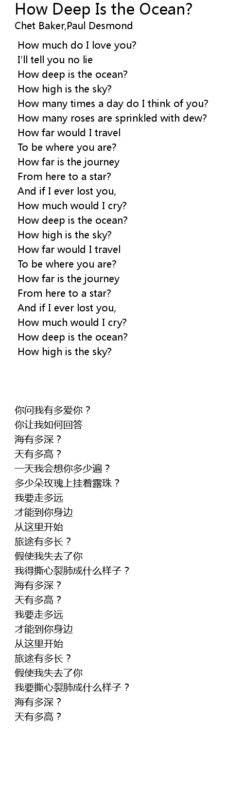 | [01:29.118] | How deep is the ocean? |