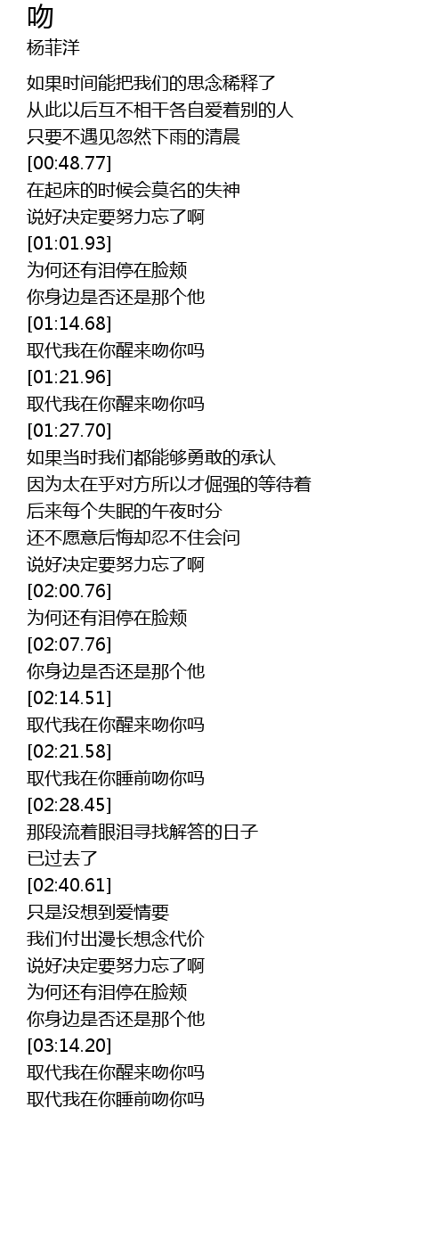 | [02:15.48] | qǔ dài wǒ zài nǐ xǐng lái wěn nǐ ma |