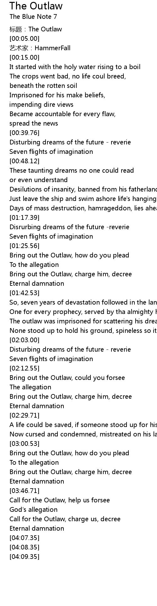 | [03:39.42] | Bring out the Outlaw, charge him, decree |