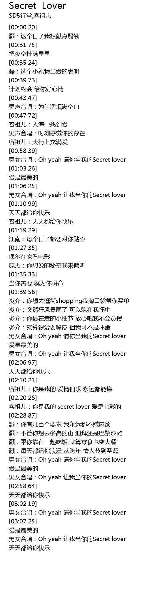 | [02:02.85] | 男女合唱:Oh yeah 让我当你的Secret lover |