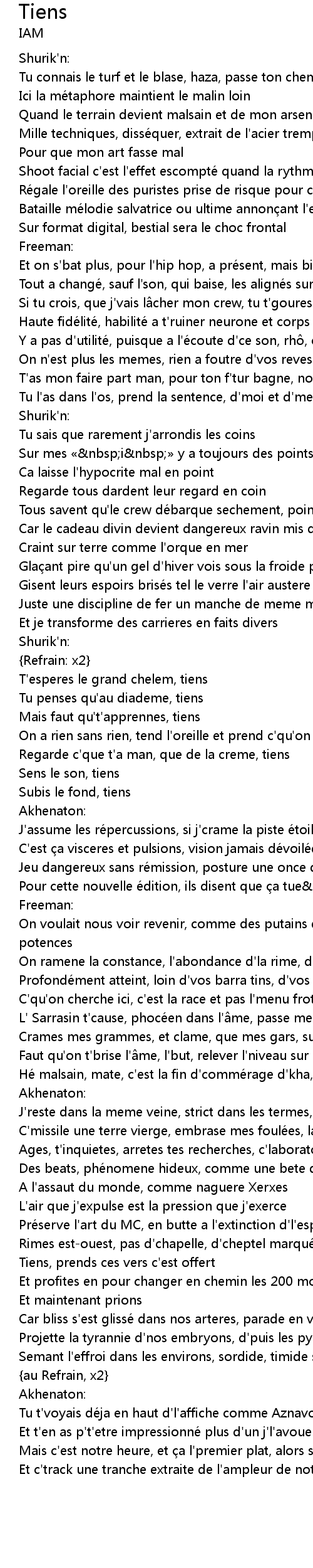 | Tous savent qu' le crew dé barque sechement, pointu comme surin | |