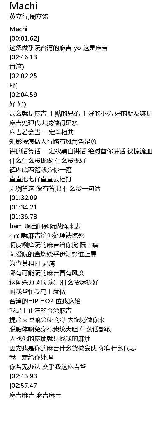 | [00:02.49] | 这条做乎阮台湾的麻吉 yo 这是麻吉 |