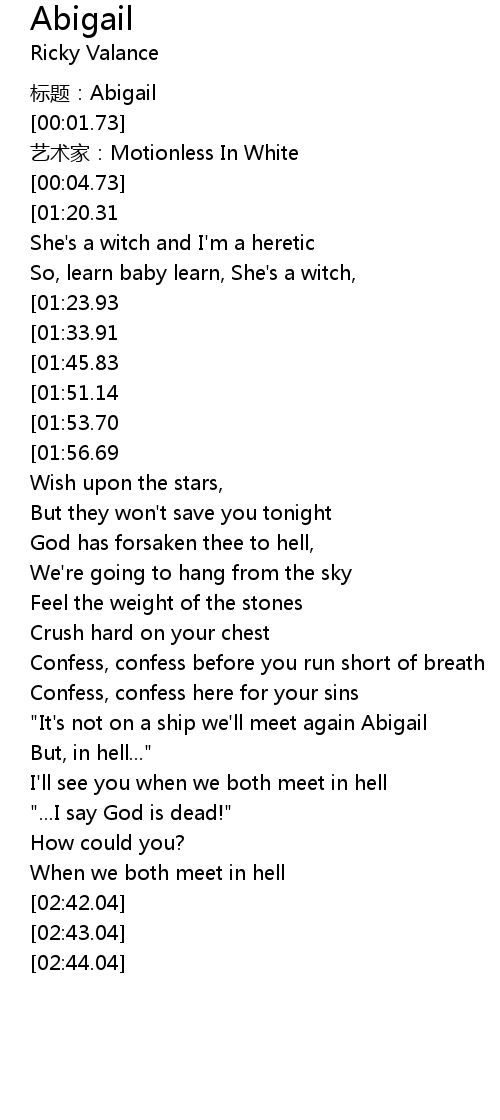 | [00:24.21][01:33.91][01:41.90] | Oh Abigail how could you do this to us? |