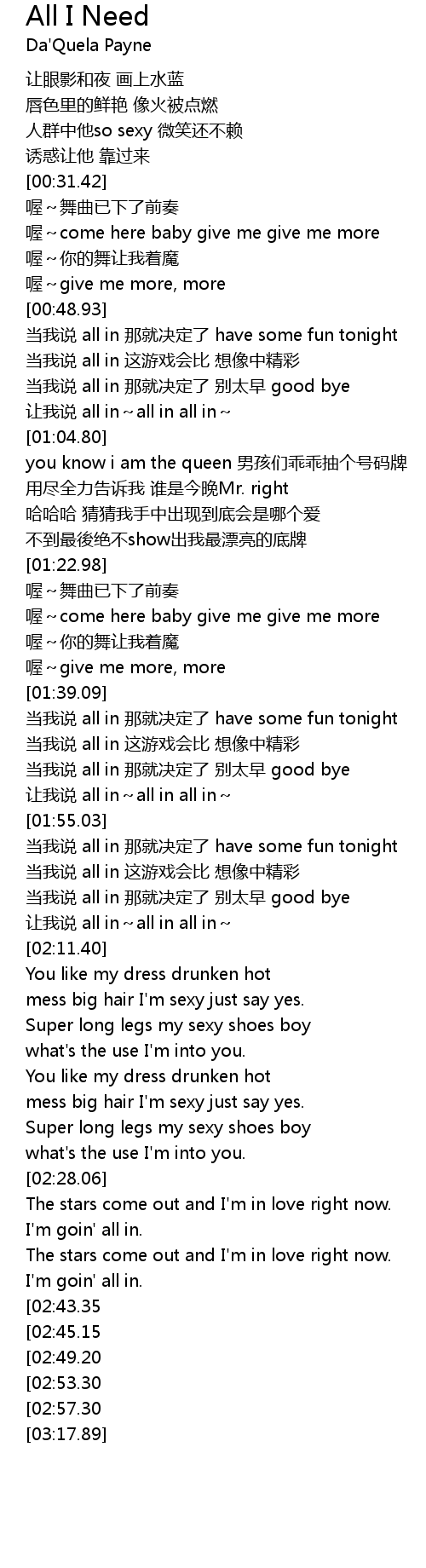 | [03:00.93][02:45.15] | 当我说 all in 那就决定了 have some fun tonight |