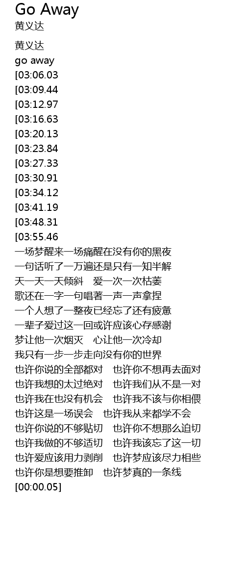 | [00:47.08][03:23.84] | yi shou ge chang wan yi dao bie jiu yao zheng shi jie shu yi qie |