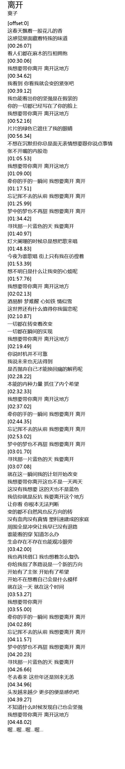 | [01:19.26] | 忘记挥不去的从前 我想要离开 离开 |