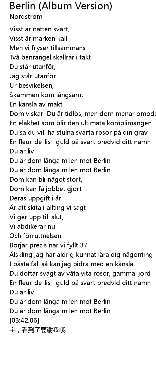 | [03:26.74] | Du är dom långa milen mot Berlin |
