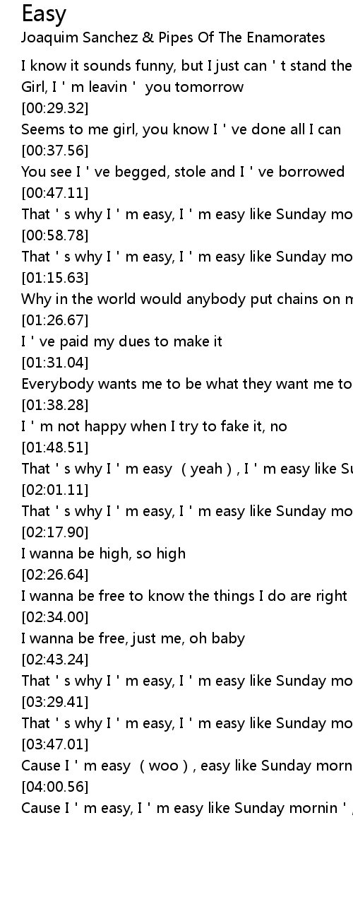 | [01:03.89] | That's why I'm easy, I'm easy like Sunday mornin' |