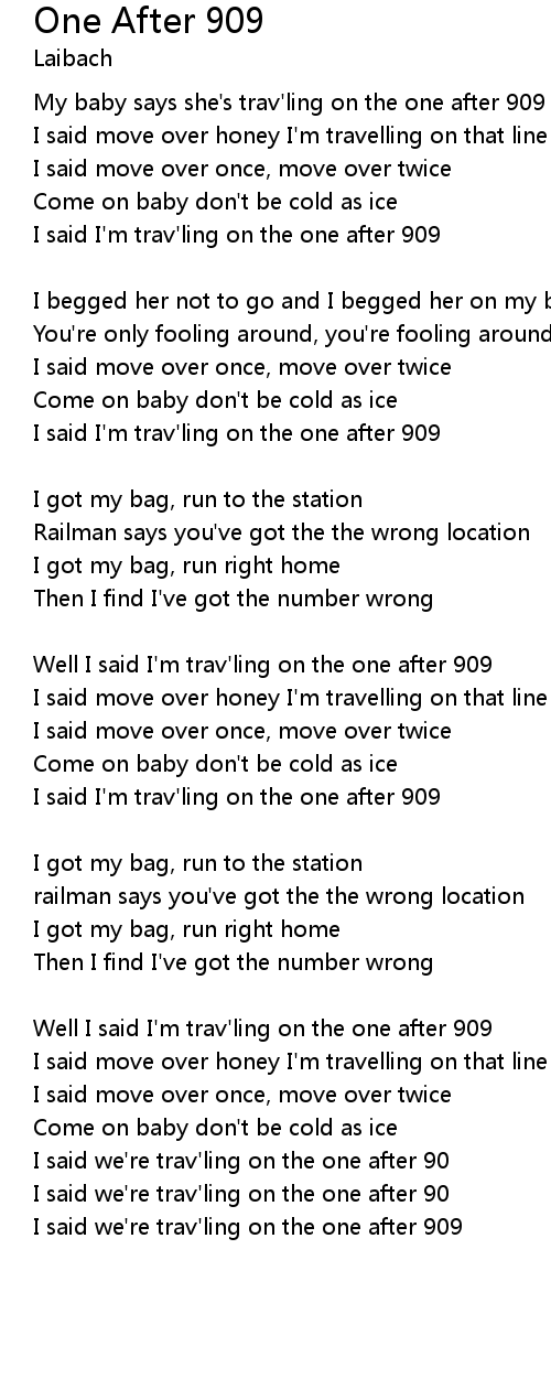 | My baby says she's trav'ling on the one after 909 | |