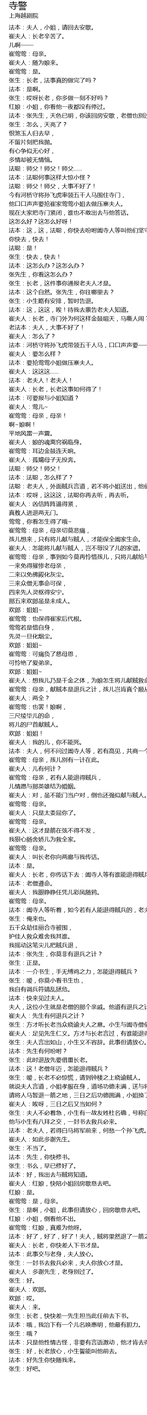 | [10:47.30] | 崔夫人:长老,你传话下去:阖寺人等有谁能退得贼兵的,老身做主,倒赔妆奁,愿将小女莺莺与他为妻。 |