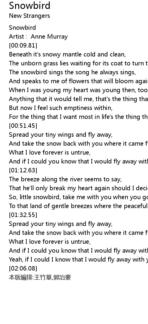 | [00:20.44] | The snowbird sings the song he always sings, |