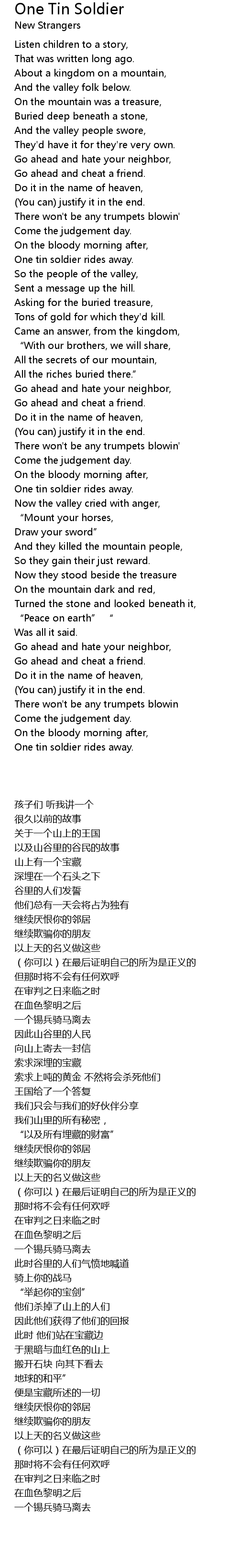 | 歌曲 | One Tin Soldier |