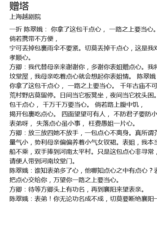 | yī zhé chén cuì é: nǐ ná le zhè bāo gān diǎn xīn, yí lù zhī shàng yào dāng xīn. tǎng ruò xié dài bù fāng biàn, nìng kě diū diào bāo guǒ yǔ sǎn bú yào jǐn. qiè mò diū diào gàn diǎn xīn, zhè shì wǒ duì jiù mā yī piàn xiào shùn xīn. fāng qīng: wǒ dài tì mǔ qīn lái xiè xiè nǐ, duō xiè nǐ biǎo jiě zèng diǎn xīn. wǒ jiāng diǎn xīn dài dào fén táng wū, wǒ mǔ qīn chī zhe diǎn xīn jiù huì xiǎng qǐ nǐ biǎo jiě qíng. chén cuì é: nǐ ná le zhè bāo gān diǎn xīn, yí lù zhī shàng yào dāng xīn. qiān nián gǔ miào bù kě sù, huāng cūn yě diàn mò liú tíng. rì jiān dāng tā bǎn dèng zuò, yè jiān dāng tā zhěn tou kùn. nǐ ná le zhè bāo gān diǎn xīn, qiān wàn qiān wàn yào dāng xīn. tǎng ruò lù shàng fù zhōng jī, jiē kāi bāo guǒ chī diǎn xīn. sì miàn wàng wàng kě yǒu rén, bù fáng jūn zǐ yào fáng xiǎo rén. biǎo dì ya, shī luò diǎn xīn suī xiǎo shì, wǎng fèi yú jiě yī piàn xīn. fāng qīng: fàng sān fàng sì tā bù fàng shǒu, yī bāo diǎn xīn bù lí shēn. zhēn suǒ wèi jiè cài zǐ dù cháng liàng qì xiǎo, shì lì mǔ qīn piān piān yǎng zhe xiǎo qì nǚ chāi qún. biǎo jiě, wǒ běn dāng jiào bù zuò lái chuán bù chéng, shuāng shǒu pěng dào hé nán tài píng cūn. zhǐ shì zhè bāo diǎn xīn fēi xún cháng, hái shì gé rì qǐng pián rén dài dào hé nán fén táng mén. chén cuì é: shéi zhī biǎo dì duō le xīn, tā nǎ zhī diǎn xīn zhī zhōng yǒu diǎn xīn? biǎo dì ya, wǒ bǎ diǎn xīn jiāo gěi nǐ, wàn wàng nǐ yí lù zhī shàng yào dāng xīn. fāng qīng: dài děng fāng qīng tóu shàng yǒu gōng míng, zài dào xiāng yáng lái wàng biǎo qīn. chén cuì é: biǎo dì! nǐ wú lùn gōng míng chéng bù chéng, qiè mò yào duàn jué xiāng yáng yī mài qīn. |