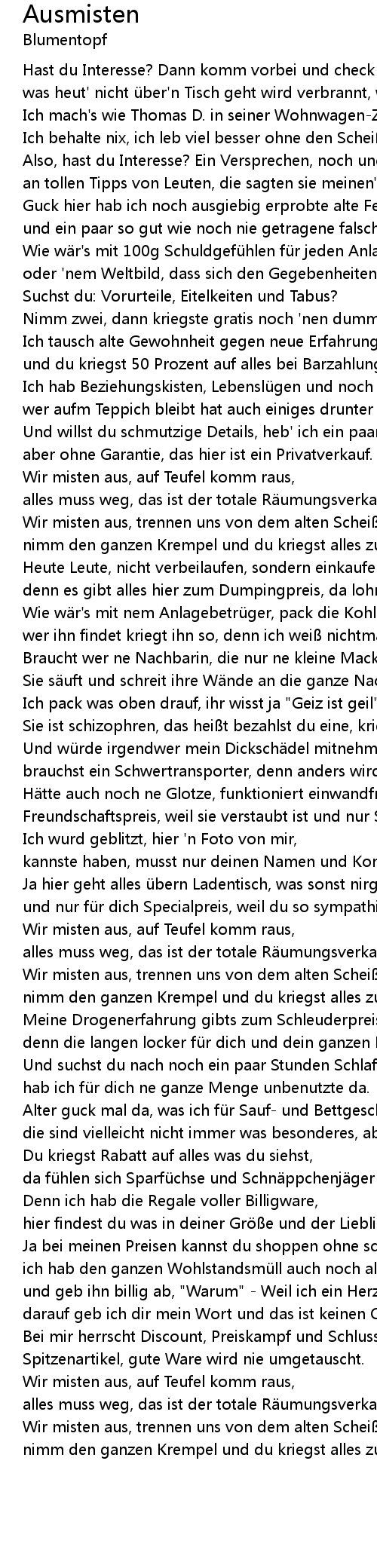 | Meine Drogenerfahrung gibts zum Schleuderpreis, | |