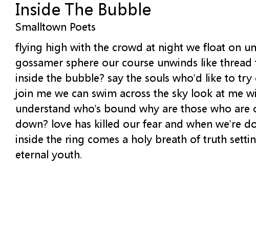 flying high with the crowd at night we float on unseen fuel each one sails, a gossamer sphere our course unwinds like thread from a spool what's it like inside the bubble? say the souls who'd like to try cut your tether; come and join me we can swim across the sky look at me with a childlike eye and understand who's bound why are those who are on the ground afraid of falling down? love has killed our fear and when we're done we'll disappear draws you out inside the ring comes a holy breath of truth setting free and sealing you in eternal youth. |