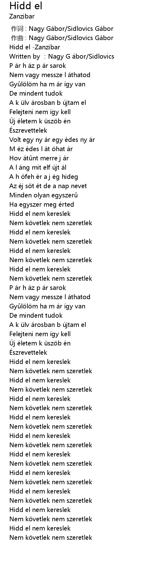 | [00:00.000] | zuò cí : Nagy Gá bor Sidlovics Gá bor |