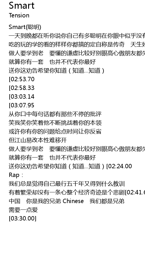 | [03:22.19][03:03.14][02:13.05][01:07.07] | 聪明 聪明不要一直觉得自己聪明 |