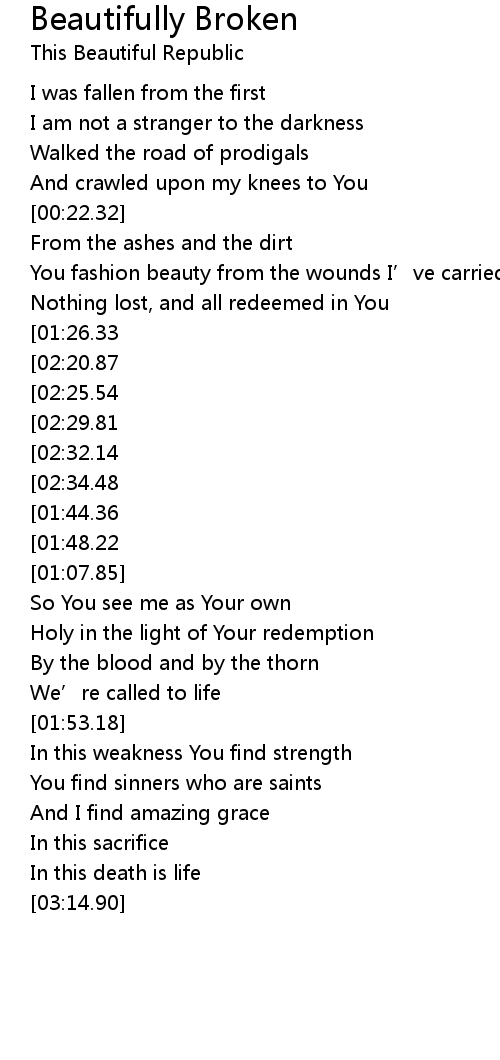 | [02:39.26][02:20.87][01:26.49][00:40.87] | Beautifully broken in Your eyes |