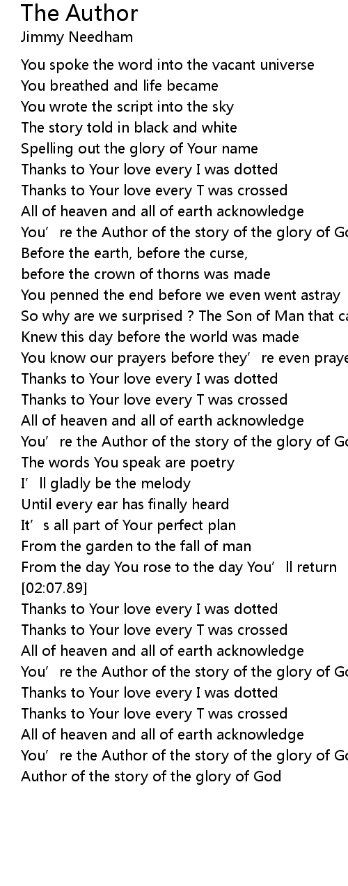 | [02:59.63] | You’re the Author of the story of the glory of God You’re the Author of the story of the glory of God |