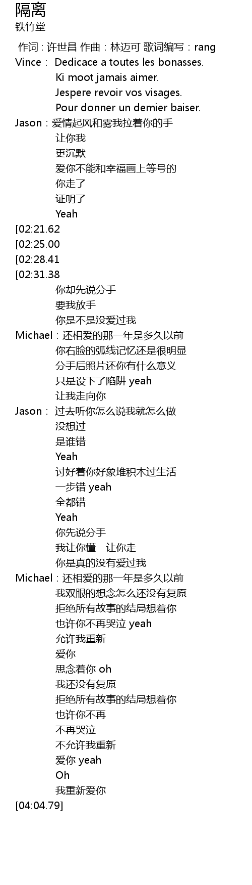 | [00:54.64][02:21.62] | Scottie:我像影子被隔离 |