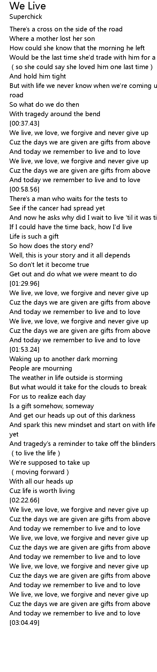 | [02:54.80] | We live, we love, we forgive and never give up |