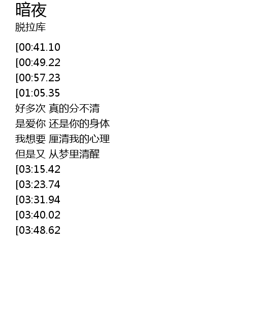 | [05:17.15][03:40.02][02:10.05] | 在暗夜 梦和现实分不清 |