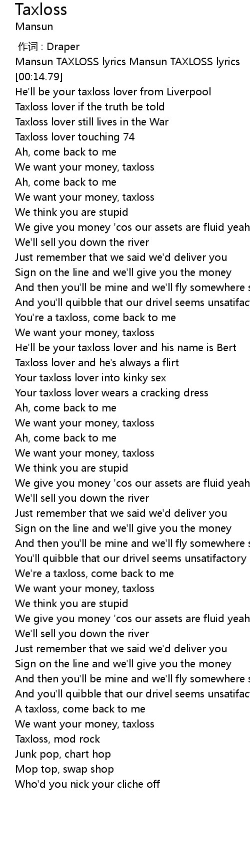 | [00:13.33] | Mansun TAXLOSS lyrics Mansun TAXLOSS lyrics |