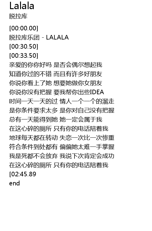 | [03:15.67][02:45.89][01:39.97] | LALALALALALALALALALALALA............ |