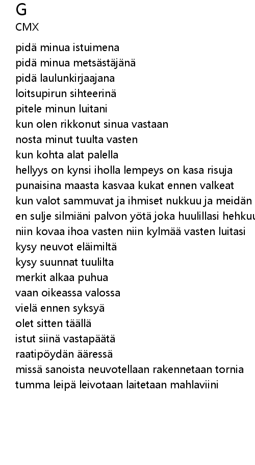 | en sulje silmi ni palvon y t joka huulillasi hehkuu | |