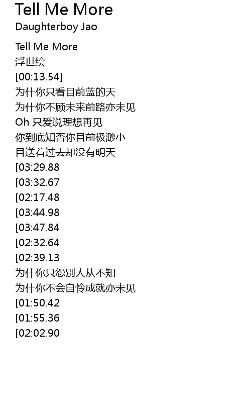 | [04:10.55][03:47.84][02:27.95][01:23.48] | Tell me more |