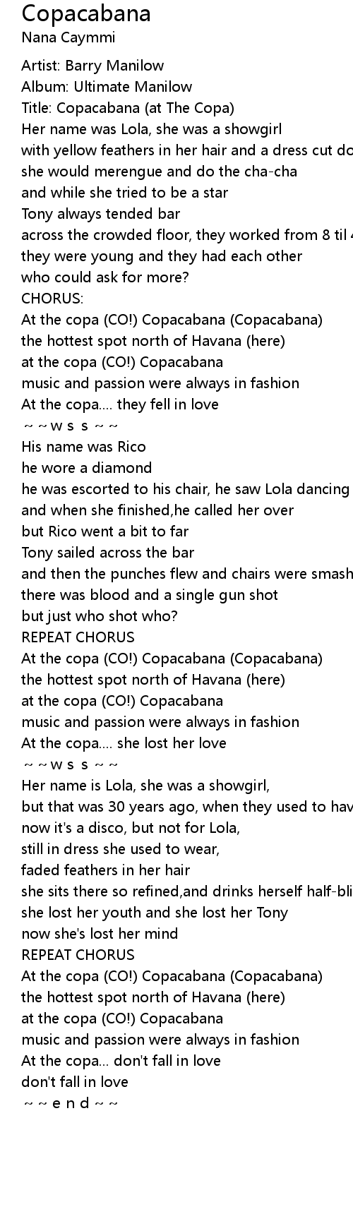 | [00:50.28] | At the copa (CO!) Copacabana (Copacabana) |