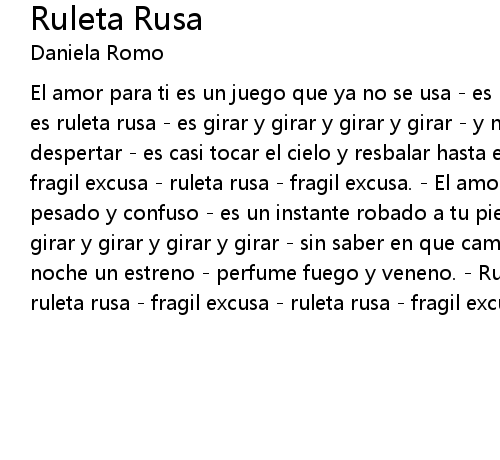 | El amor para ti es un juego que ya no se usa es mostrar el paisaje a un ciego es ruleta rusa es girar y girar y girar y girar y no saber ma ana con quien despertar es casi tocar el cielo y resbalar hasta el suelo. Ruleta rusa fragil excusa ruleta rusa fragil excusa. El amor para ti es un sue o pesado y confuso es un instante robado a tu piel que termina en abuso es girar y girar y girar y girar sin saber en que cama vas a terminar es cada noche un estreno perfume fuego y veneno. Ruleta rusa fragil excuda ruleta rusa fragil excusa ruleta rusa fragil excusa. |