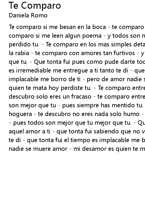 Te comparo si me besan en la boca - te comparo cuando me llenan de rosas - te comparo si me leen algun poema - y todos son mejor que tu - pues siempre has perdido tu. - Te comparo en los mas simples detalles - te comparo y me muero de la rabia - te comparo con amores tan furtivos - y todos son mejor que tu mejor que tu. - Que tonta fui pues como pude darte todo lo de mi - que tonta fui pero es irremediable me entregue a ti tanto te di - que tonta fui el tiempo es implacable me borro de ti - pero de amor nadie se muere amor - mi desamor es quien te mata hoy perdiste tu. - Te comparo entre sabanas y abrazos - te descubro solo eres un fracaso - te comparo entre frases entre lineas - y todos son mejor que tu - pues siempre has mentido tu. - Te comparo en el cielo y en la hoguera - te descubro no eres nada solo humo - te comparo y pareces tan absurdo - pues todos son mejor que tu mejor que tu. - Que tonta fui pues como pude darte aquel amor a ti - que tonta fui sabiendo que no vales lo que crees valer cuanto te di - que tonta fui el tiempo es implacable me borro de ti - pero de amor nadie se muere amor - mi desamor es quien te mata hoy perdiste tu. |