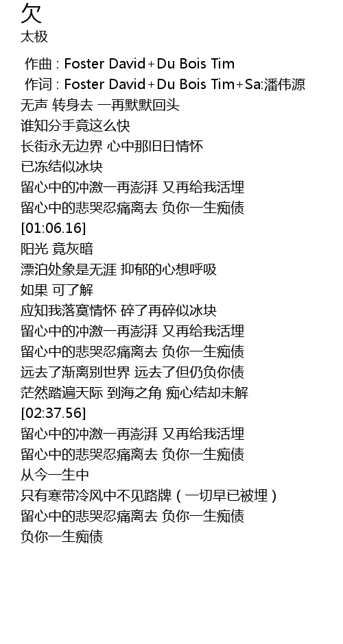 | [00:01.00] | zuò cí : Foster David Du Bois Tim Sa: pān wěi yuán |