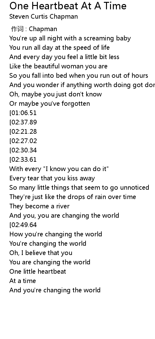 | [03:12.20][02:37.89][02:18.14][01:30.90][01:10.30] | One little heartbeat at a time |