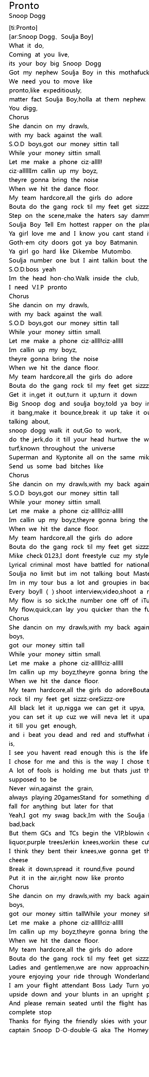 | [04:48.960] | Thanks for flying the friendly skies with your friendly captain Snoop D-O-double-G aka The HomeyNEW SONG 2010!!!!!S.O.D |