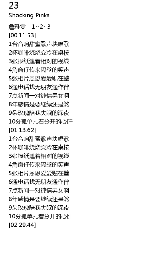 | [00:07.53] | 詹雅雯 - 1~2~3 |