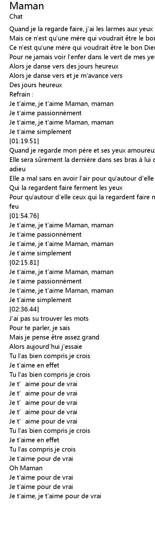 | [00:59.14] | Je t'aime, je t'aime Maman, maman |