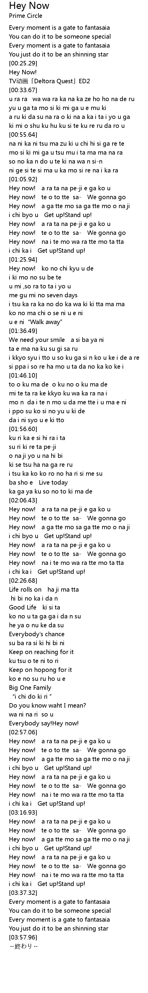 | [02:21.56] | Hey now! na i te mo wa ra tte mo ta tta |