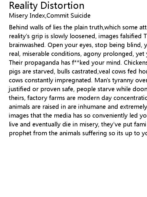 Behind walls of lies the plain truth,which some attempt to deny and hide, reality's grip is slowly loosened, images falsified The media shit has you brainwashed. Open your eyes, stop being blind, you clearly see the horrors are real, miserable conditions, agony prolonged, yet you ignore the pain they feel. Their propaganda has f**ked your mind. Chickens debeaked, chicks are smothered, pigs are starved, bulls castrated,veal cows fed hormones, antibiotics, female cows constantly impregnated. Man's tyranny over other living beings cannot be justified or proven safe, people starve while doomed cows eat what could be theirs, factory farms are modern day concentration camps. The conditions these animals are raised in are inhumane and extremely cruel, forget these fairytale images that the media has so conveniently led you to beleive, they are reared to live and eventually die in misery, they've put family farms out of business, you prophet from the animals suffering so its up to you and I to stop the torture!!! |