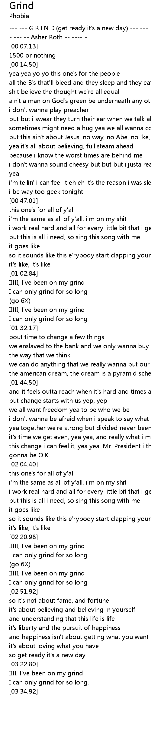 | [00:01.08] | --- --- G.R.I.N.D.(get ready it's a new day) --- --- |