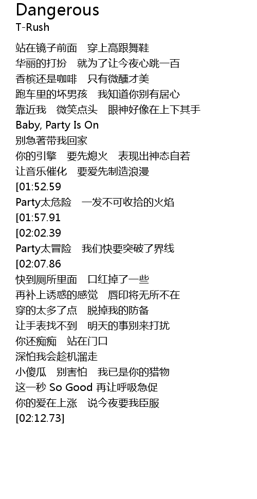 | [02:53.88][01:52.59][02:33.86][00:51.56] | 夜太美 Party太危险 一发不可收拾的火焰 |