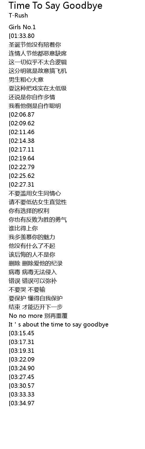 | [03:44.69][03:22.09] | 就跟他 say goodbye/不要哭 不要输/say goodbye |