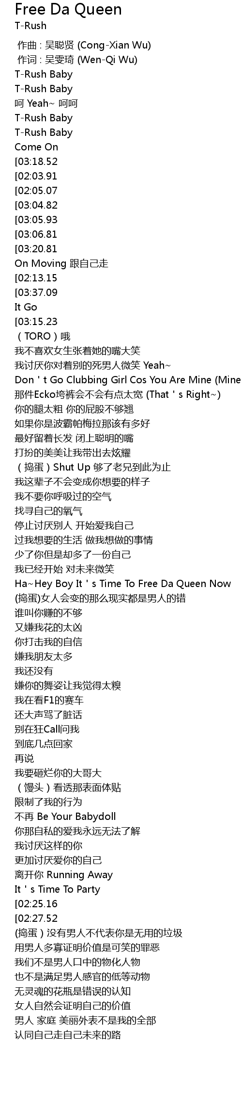 | [02:34.54][02:25.16] | It s Time To Free Da Queen |