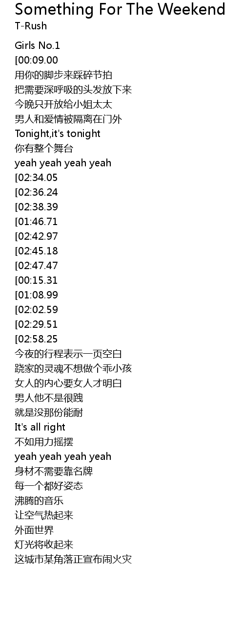 | [03:07.19][02:58.25][02:49.34][02:40.38][02:31.70] | Something For The Weekend |