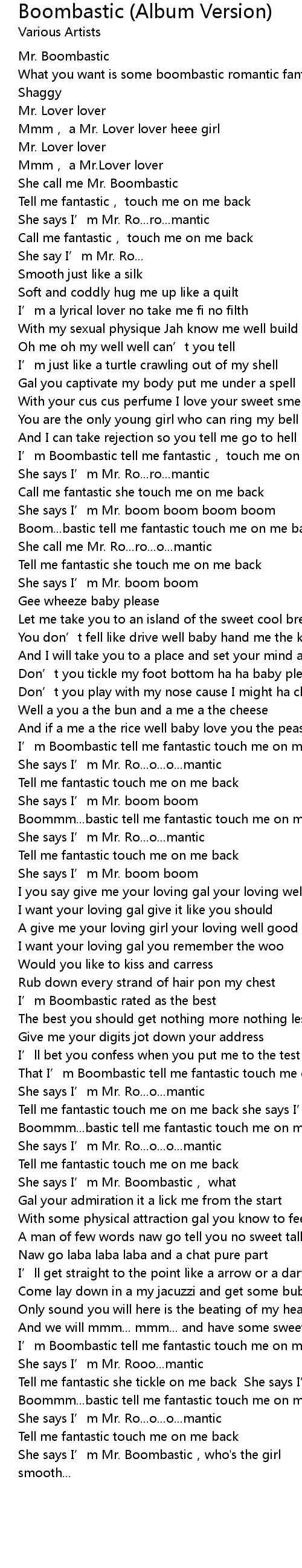 | [02:51.39] | That I' m Boombastic tell me fantastic touch me on me back |