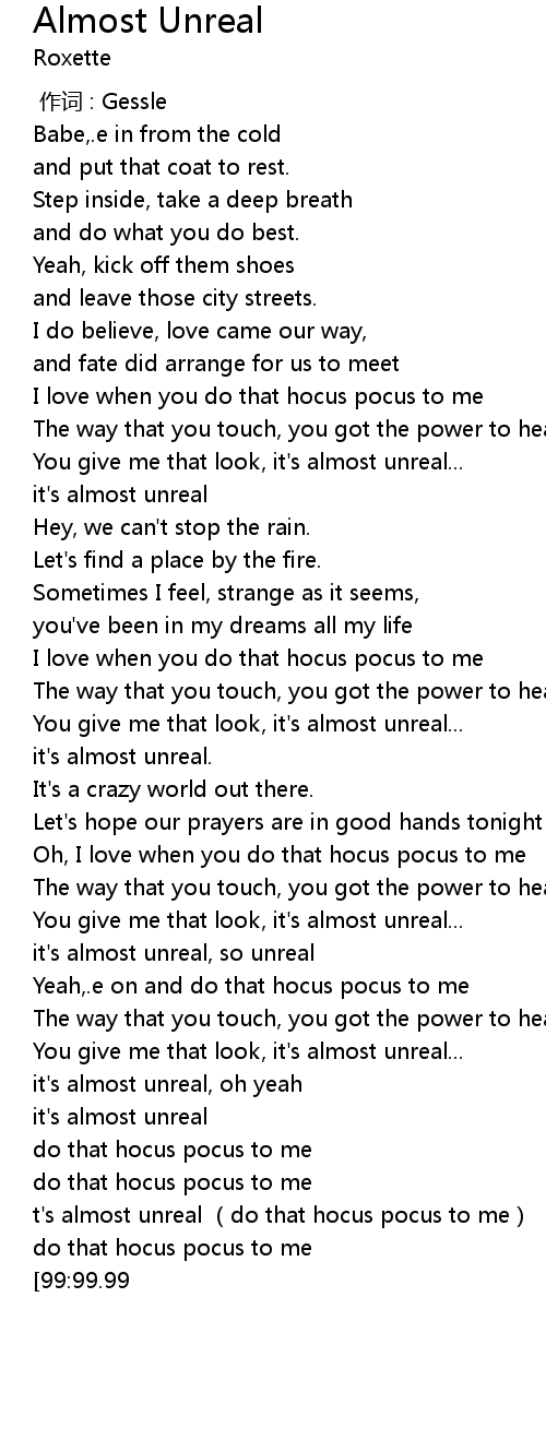 | [03:35.99] | t's almost unreal (do that hocus pocus to me) |