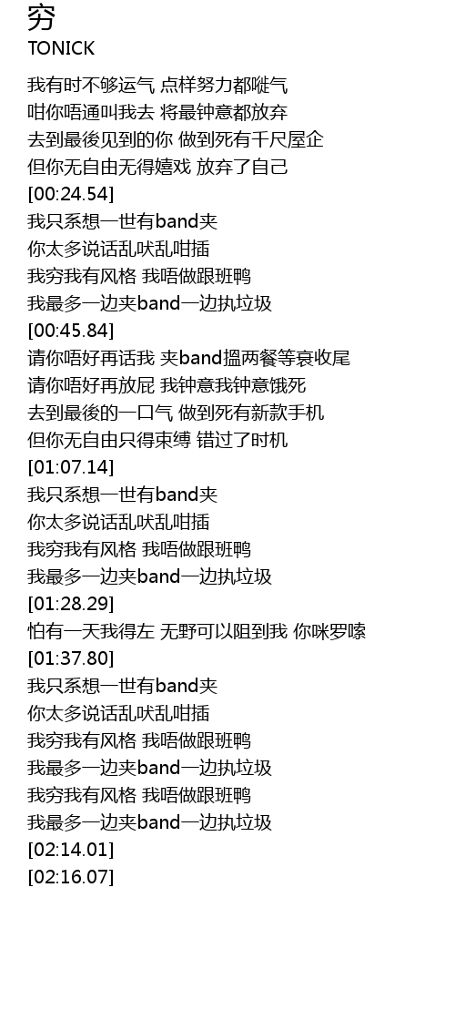 | [01:58.89] | 我穷我有风格 我唔做跟班鸭 |